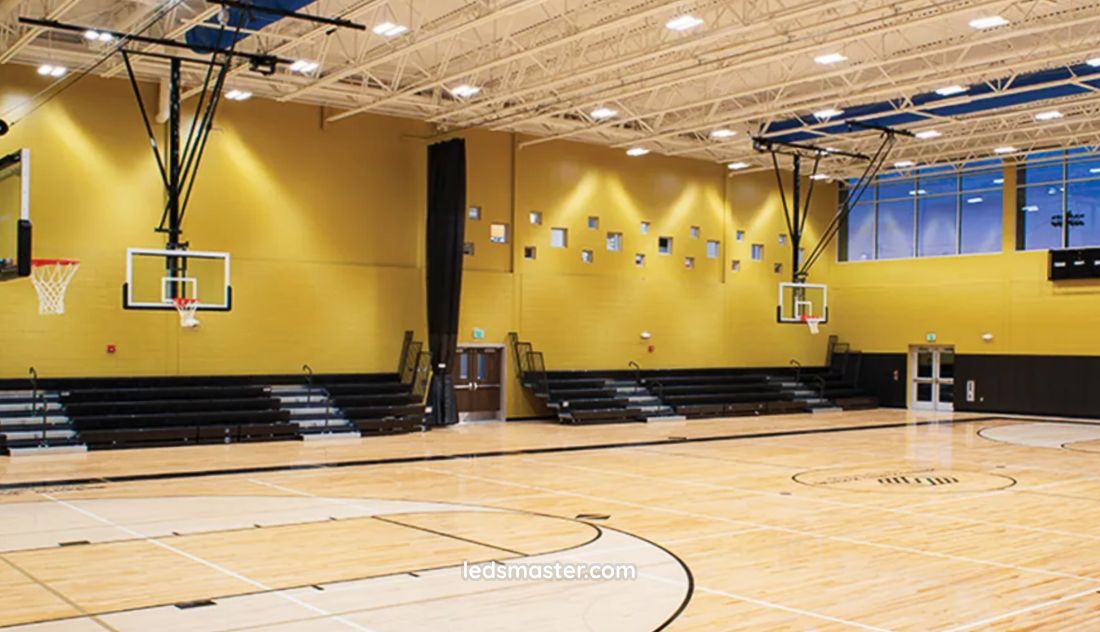 Other small factors can matter as well: wall color, ceiling, flooring, and even hanging equipment like banners or bleachers can affect how light spreads. Light-colored surfaces reflect more light, improving brightness, while darker surfaces absorb it, meaning you may need extra fixtures to compensate.
